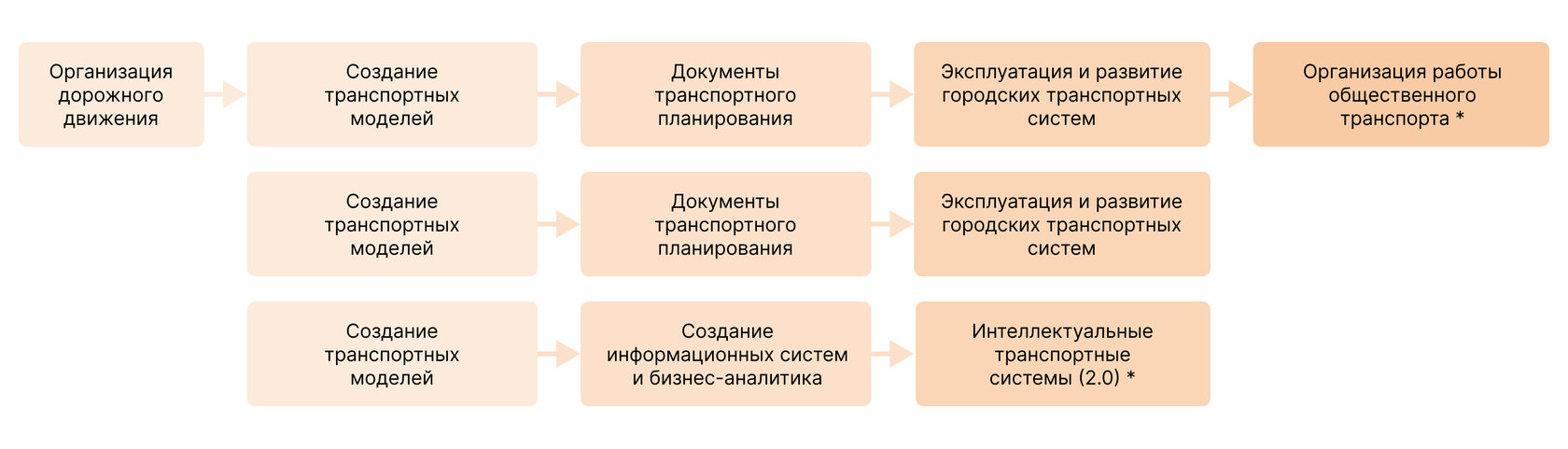 Профессиональная область транспортной инженерии включает пять основных специализированных сферы деятельности – транспортные системы, интеллектуальные транспортные системы, пассажирские перевозки, грузовые перевозки, организация и безопасность дорожного движения (для последних двух сфер матрицы компетенций находятся в разработке).